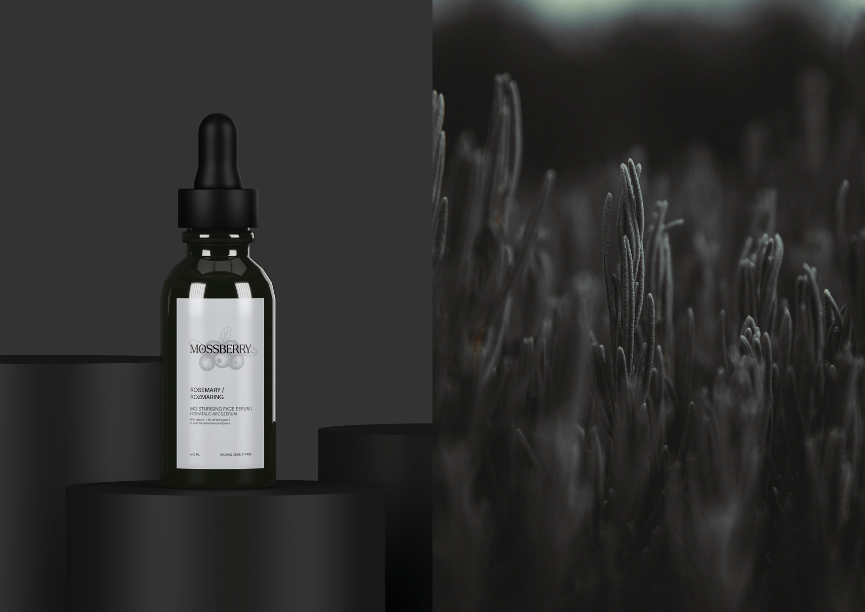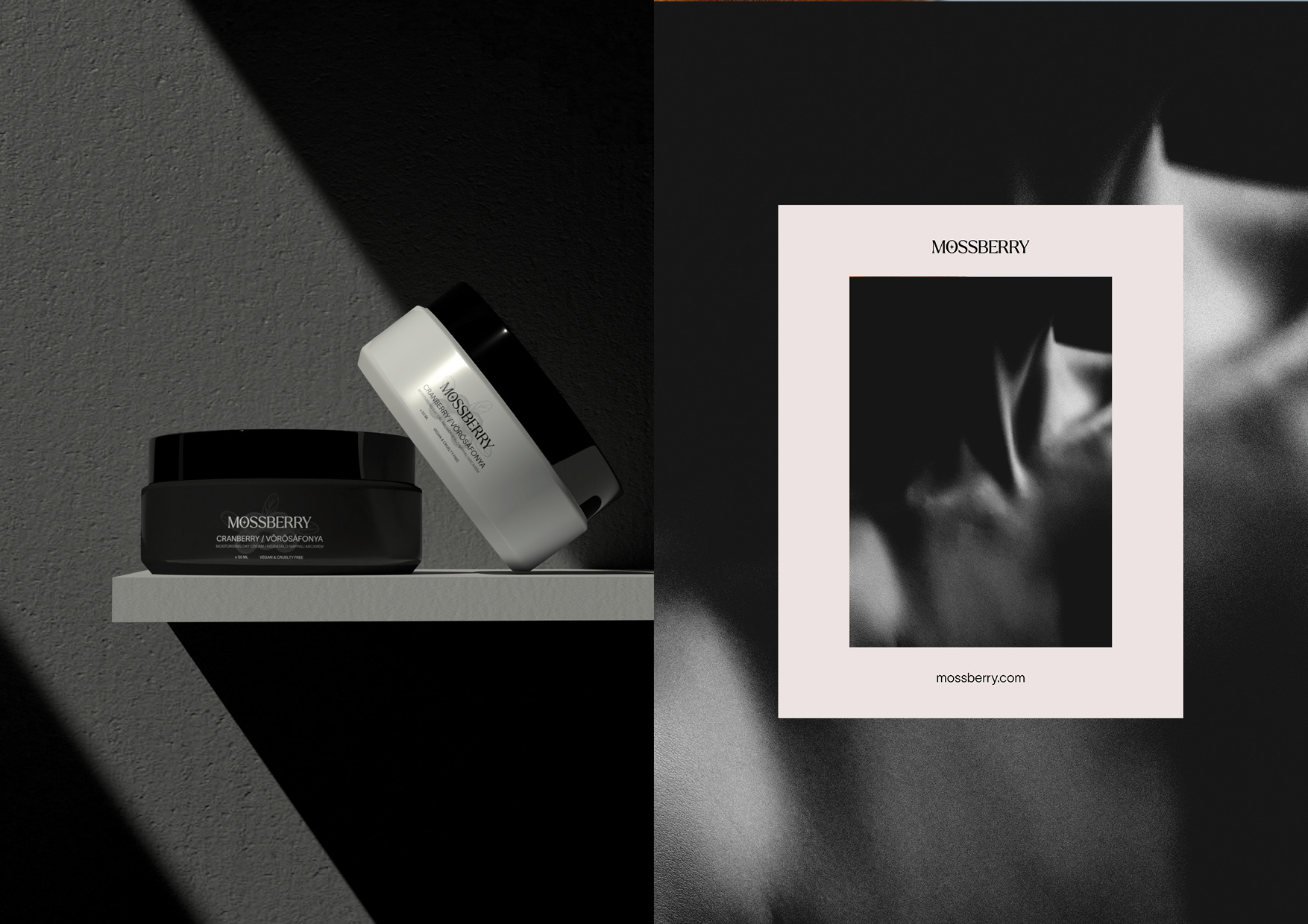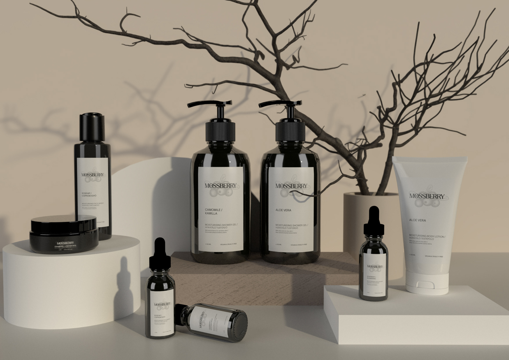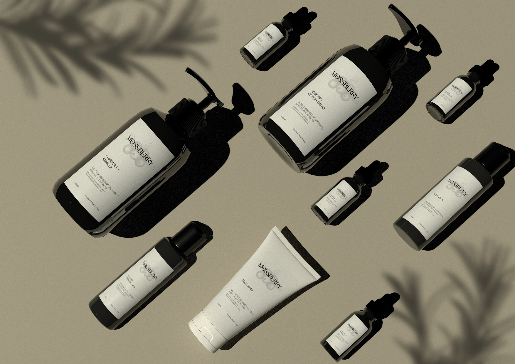 Branding and packaging design for Mossberry cosmetics line.